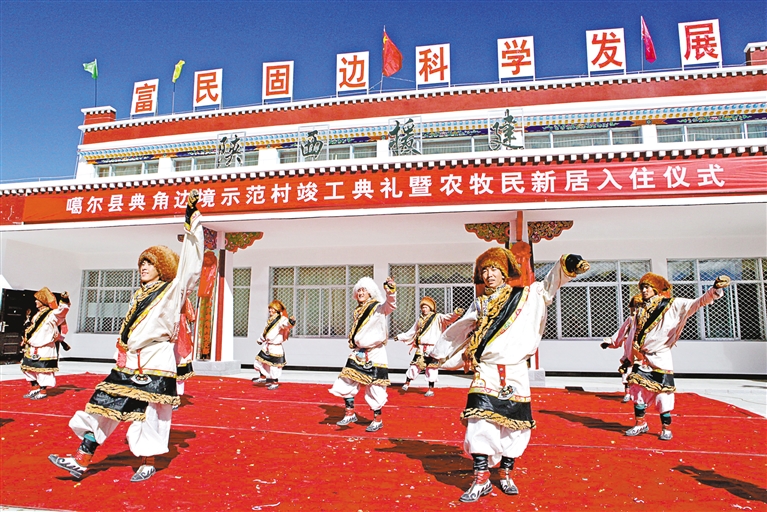 2012年10月,由陜西省援建的阿里地區(qū)首個邊境小康示范村——噶爾縣扎西崗鄉(xiāng)典角村竣工。這是入住儀式上,群眾跳起歡快的舞蹈。