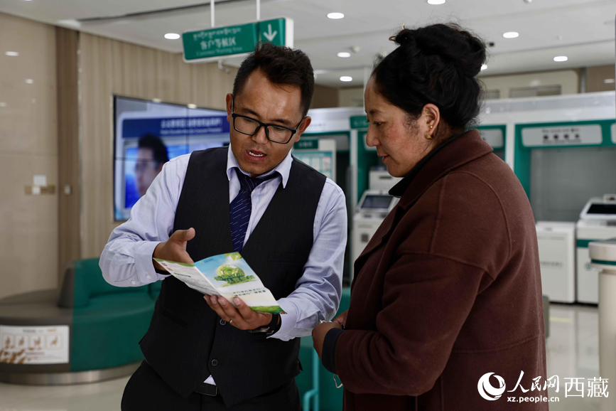 農(nóng)行洛扎縣支行工作人員在向辦事群眾講解“個(gè)人碳賬戶”。人民網(wǎng)記者 次仁羅布攝