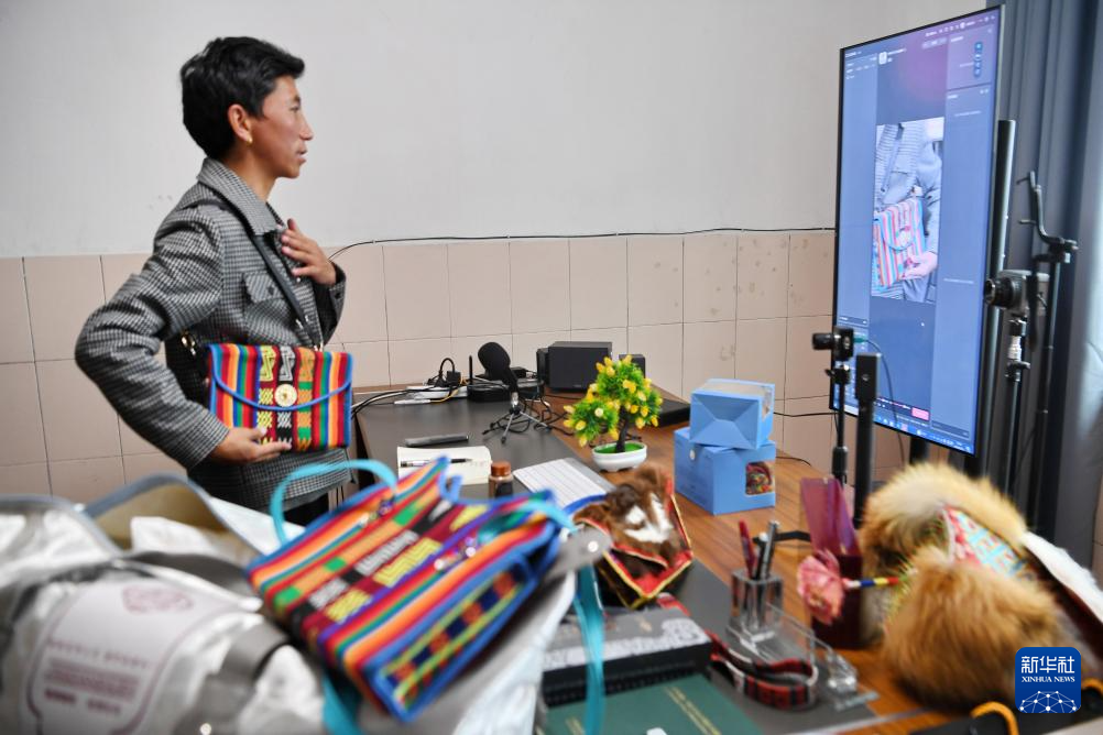 倉秋多吉通過網(wǎng)絡(luò)銷售當(dāng)?shù)氐漠a(chǎn)品(8月24日攝)。新華社記者 張汝鋒 攝