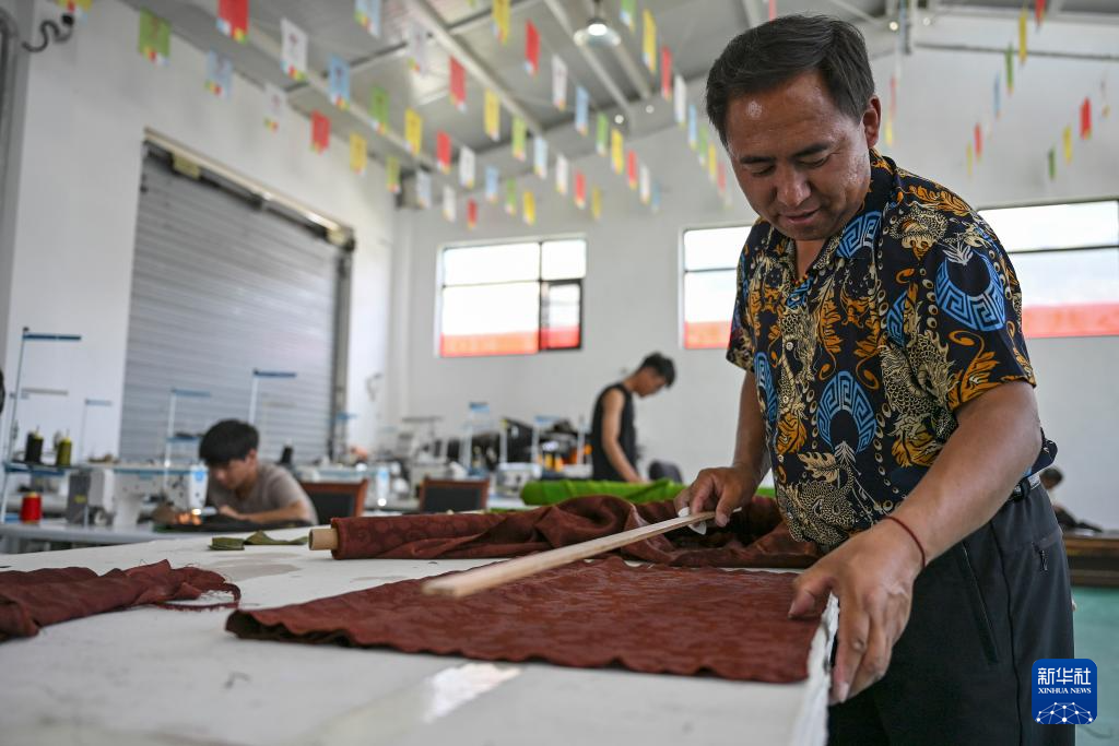 9月1日,在西藏日喀則市仁布縣特色產業(yè)孵化園,亞德細褐羊毛織品農民專業(yè)合作社工作人員在車間里準備剪裁布匹。新華社記者 孫瑞博 攝
