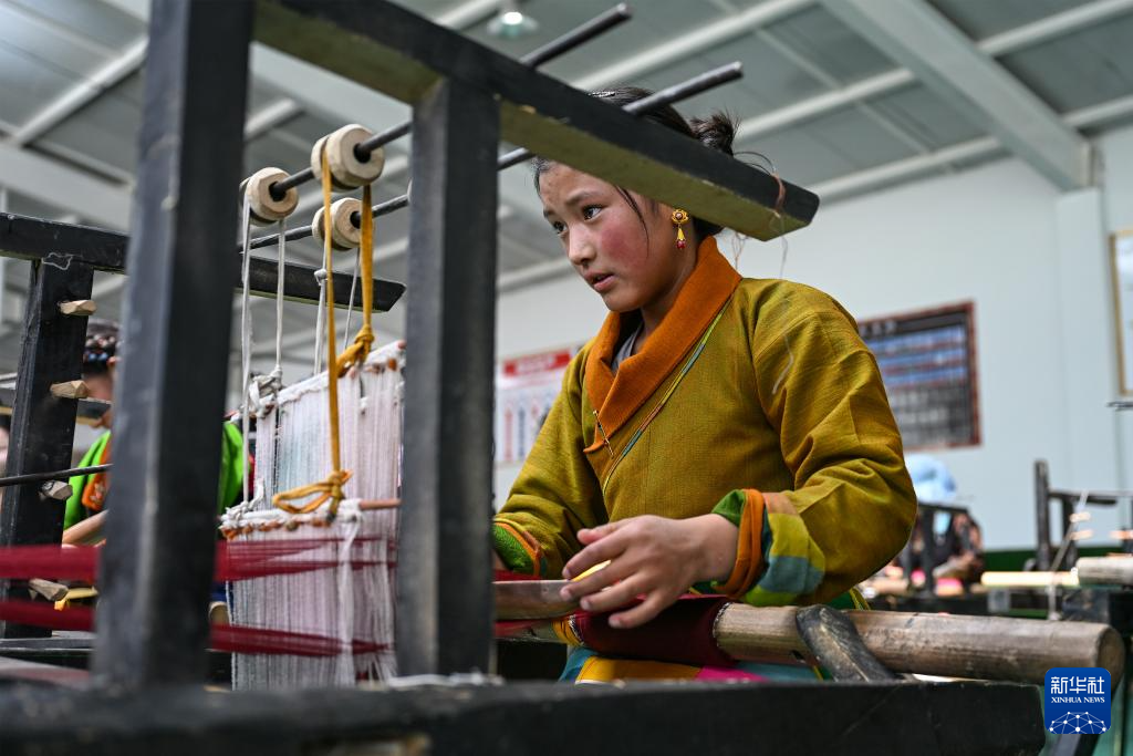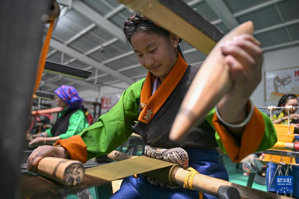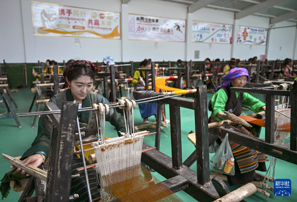 9月1日,在西藏日喀則市仁布縣特色產業(yè)孵化園,亞德細褐羊毛織品農民專業(yè)合作社工作人員在車間里織布。新華社記者 孫瑞博 攝