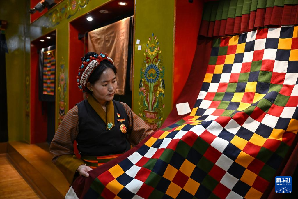 9月1日,在西藏日喀則市仁布縣特色產業(yè)孵化園,亞德細褐紡織手工藝傳承人南木珍查看展示的紡織品成品。新華社記者 孫瑞博 攝
