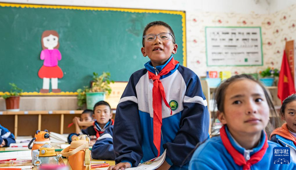 娘蒲鄉(xiāng)中心小學(xué)學(xué)生貢喬熱旦正在課堂上回答問(wèn)題(9月3日攝)。新華社記者 丁增尼達(dá) 攝