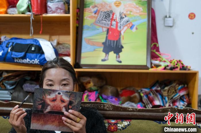 9月7日晚,西藏山南扎西曲登社區(qū)農(nóng)牧民白瑪央宗化妝準(zhǔn)備登臺(tái)表演傳統(tǒng)藏戲,山南鍋莊等。其身后是一幅藏戲畫(huà)。中新社記者 江飛波 攝