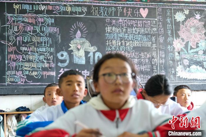 9月9日,西藏浪卡子縣中學(xué)一班級學(xué)生繪寫的教師節(jié)主題黑板報,表達對老師的尊敬與感謝。中新社記者 江飛波 攝