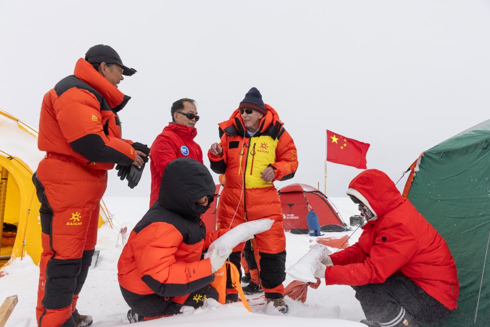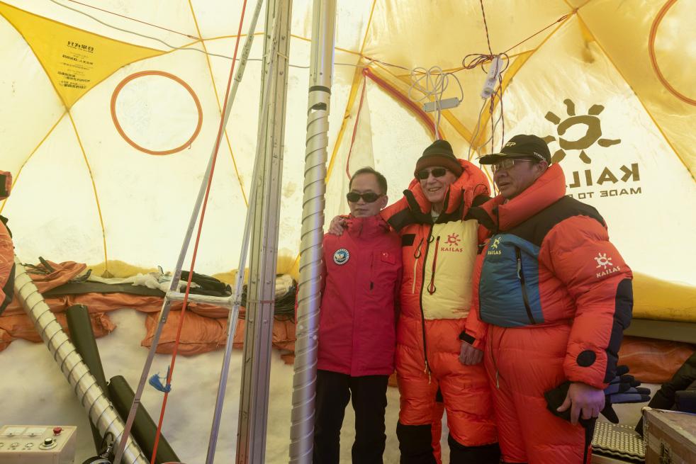 姚檀棟(左一)、湯普森(左二)在普若崗日冰原10號冰川冰穹C作業(yè)點工作帳篷內(nèi)與冰芯鉆取工作負(fù)責(zé)人徐柏青研究員合影。新華社記者姜帆 攝