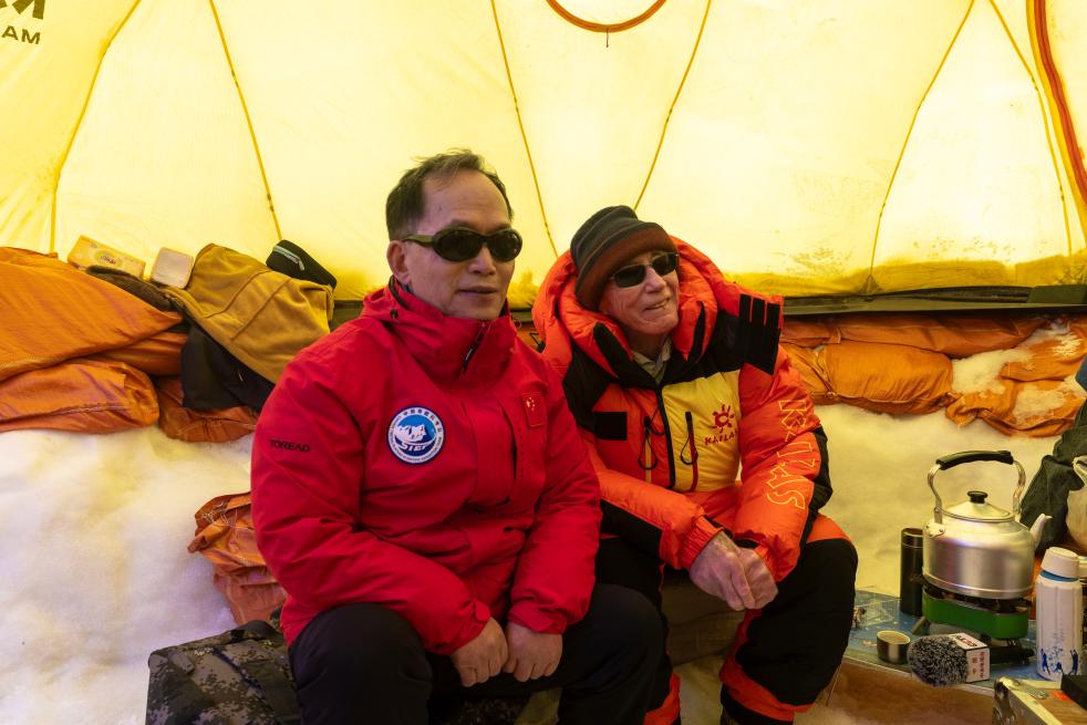 姚檀棟(左)、湯普森在普若崗日冰原10號冰川冰穹C作業(yè)點工作帳篷內(nèi)查看作業(yè)情況時合影。新華社記者姜帆 攝