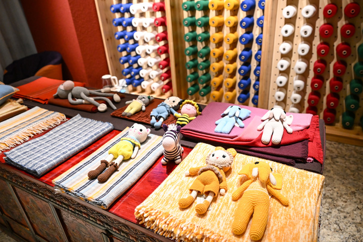 在西藏日喀則市一間門店拍攝的玩偶、圍巾、披肩等江孜氆氌產(chǎn)品。新華社記者孫瑞博 攝