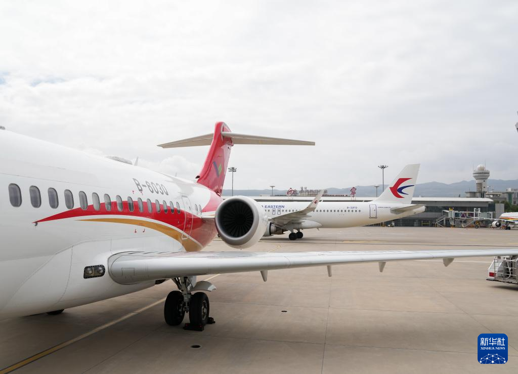 9月21日,國(guó)產(chǎn)商用飛機(jī)ARJ21停放在青海西寧曹家堡國(guó)際機(jī)場(chǎng)停機(jī)坪上。新華社記者 丁汀 攝