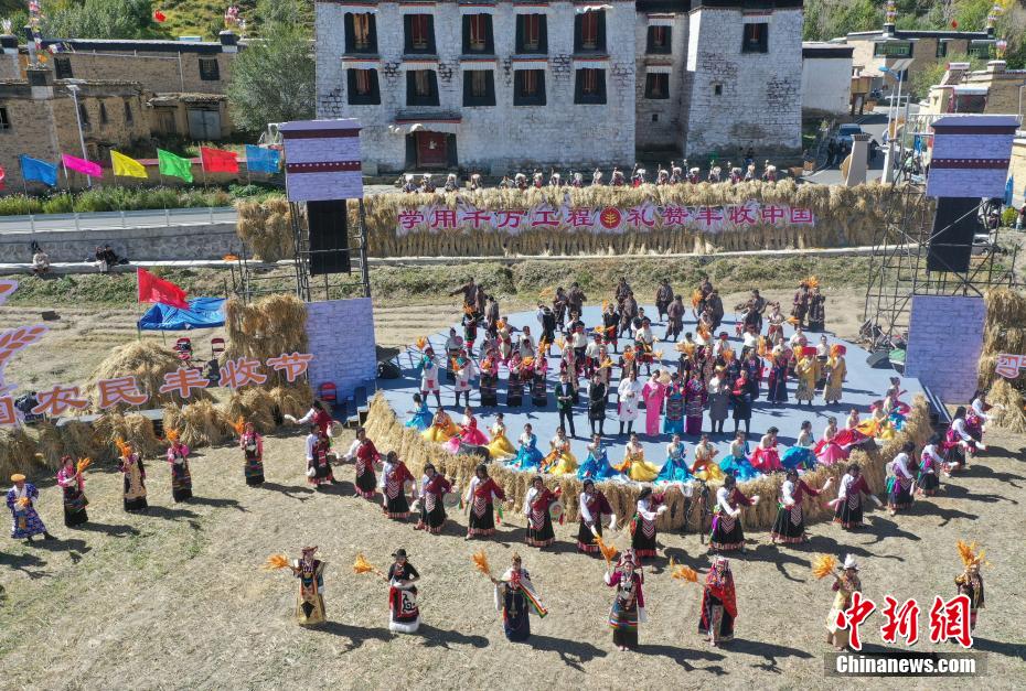 9月22日,2024年西藏“中國農(nóng)民豐收節(jié)”慶?;顒?dòng)在山南市瓊結(jié)縣拉玉鄉(xiāng)強(qiáng)吉村舉行。活動(dòng)以“學(xué)用‘千萬工程’禮贊豐收中國”為主題,由西藏各地(市)民間演出隊(duì)為大家獻(xiàn)上一場具有地域特色、體現(xiàn)農(nóng)牧民豐收喜悅的歌舞盛宴。圖為演出現(xiàn)場。(無人機(jī)照片)