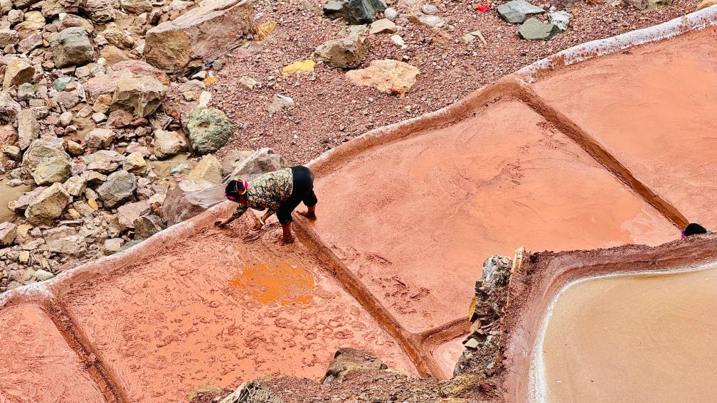沐浴著陽光和清風,鹽田反射天光。鹽花形狀像桃花瓣,色澤也微紅,讓扎西拉姆想起姥姥和一輩輩鹽井鄉(xiāng)民的臉。她說,鹽是時間的味道,也是人間的味道。