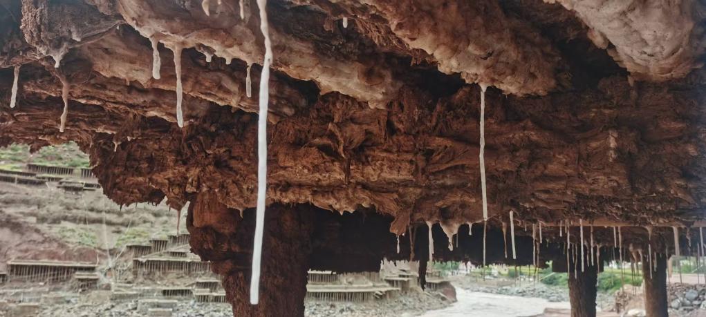 田下的鹽棚,儼然溶洞。低矮幽暗的鹽棚用西藏柏木架成,梁上掛滿鹽花,垂下的鹽柱宛如冰錐,鹽柱下方有滴鹵結晶形成的鹽筍。