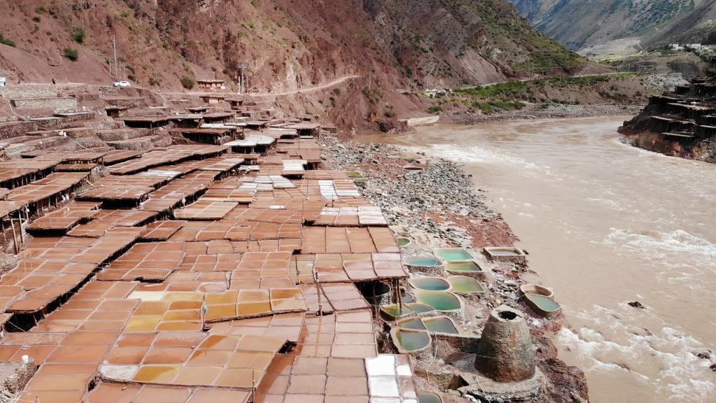 一塊塊鹽田橫連縱疊。在礦物質和微生物作用下,鹽鹵呈現不同顏色,仿佛山坡上的“調色盤”。