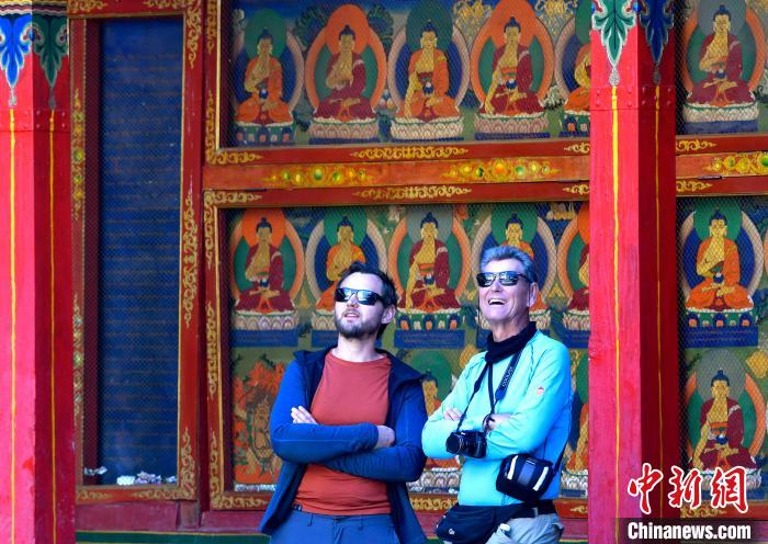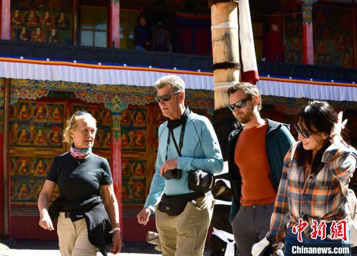 10月1日,外國游客在西藏自治區(qū)日喀則市扎什倫布寺內(nèi)參觀。國慶假期首日,始建于公元1447年的扎什倫布寺成為眾多中外游客的首選。中新社記者 李林 攝