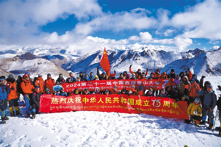 此時,倘若從山腳往上看,與雄偉圣潔的雪山相比,緩緩行進(jìn)的登山者們是如此渺小,又如此頑強(qiáng)?!皼]有比人更高的山,沒有比腳更長的路?!痹陬B強(qiáng)意志的支撐下,在向?qū)У膸椭?,在挑?zhàn)中不斷超越自我,最終,絕大部分山友沖頂成功,齊聚海拔6010米的洛堆峰頂,以實際行動慶祝中華人民共和國成立75周年。大家或在洛堆峰紀(jì)念碑前拍照打卡,或組織團(tuán)隊成員拿出提前準(zhǔn)備好的橫幅道具拍攝視頻,表達(dá)對祖國或者家人的祝福,登頂成功的喜悅洋溢在洛堆峰頂稀薄的空氣中。