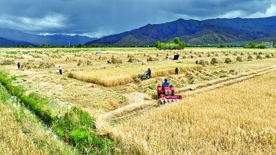 西藏日喀則市白朗縣巴扎鄉(xiāng)近年推廣“藏青3000”等青稞新品種和機械化種植,圖為農民在收獲青稞。新華社發(fā)