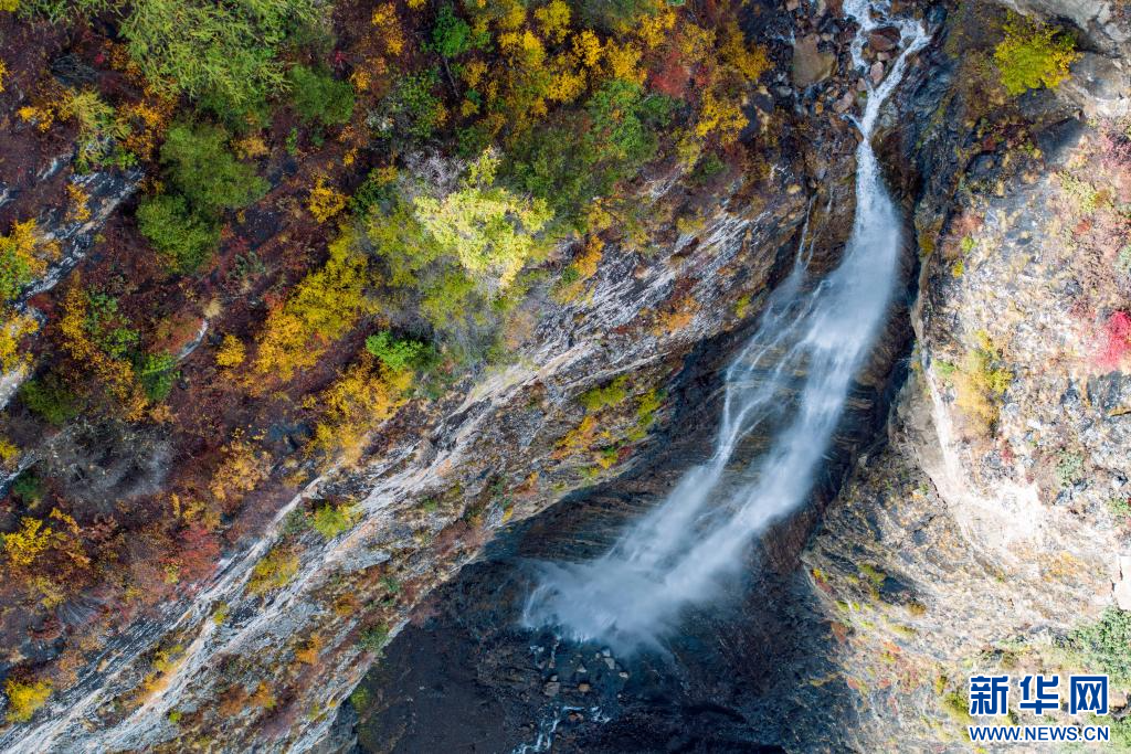 10月11日,在西藏林芝市波密縣境內(nèi)川藏公路沿途拍攝的瀑布(無人機(jī)照片)。新華網(wǎng) 旦增努布 攝