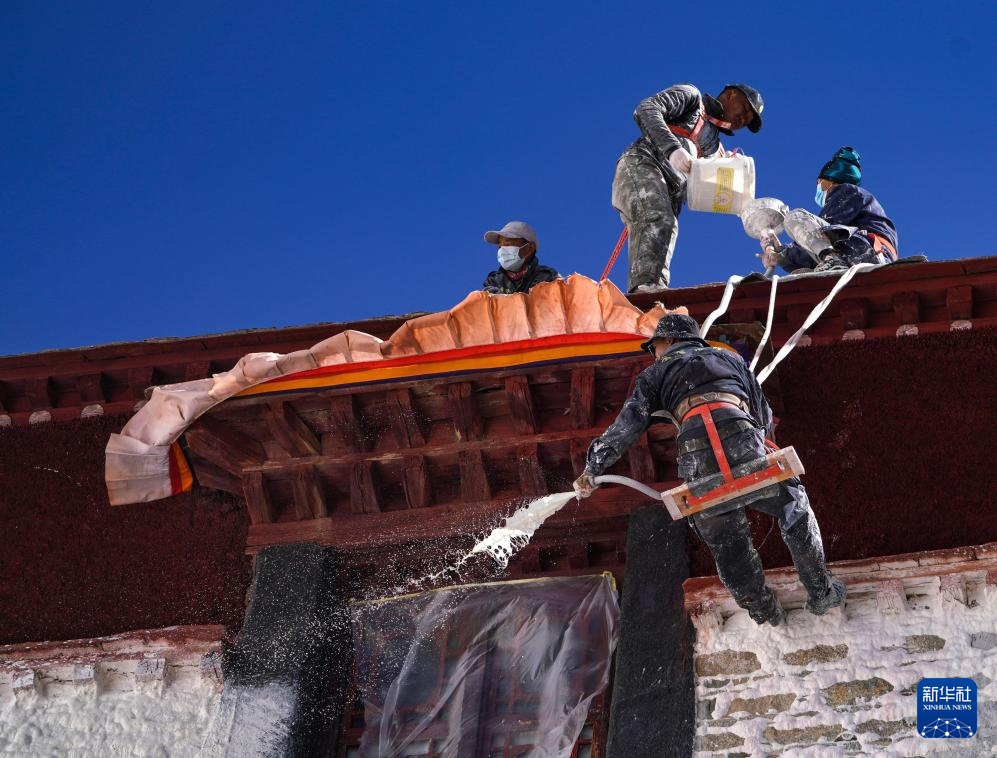 10月30日,布達(dá)拉宮管理處的工作人員在噴灑涂料。新華社記者 晉美多吉 攝