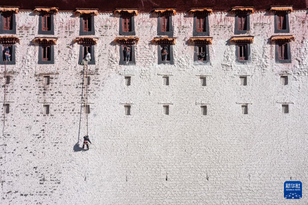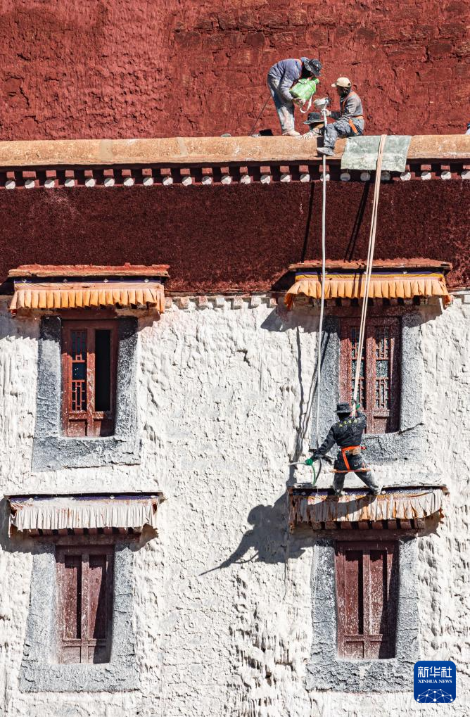 10月30日,布達(dá)拉宮管理處的工作人員在噴灑涂料。新華社記者 丁增尼達(dá) 攝