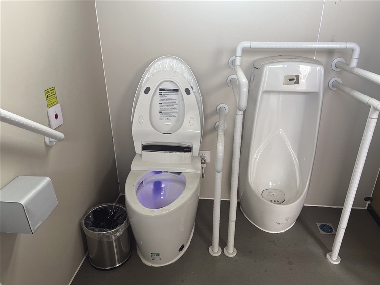 公廁內(nèi)部除了正常的蹲位,還設(shè)有第三衛(wèi)生間。第三衛(wèi)生間內(nèi)配有嬰兒護(hù)理臺(tái)、嬰兒安全座椅等設(shè)施。除此之外,第三衛(wèi)生間還設(shè)有安全扶手、智能馬桶等設(shè)備,方便腿腳不方便的老年人及殘疾人。智能馬桶旁還安裝有緊急報(bào)警器。“如果有老人在廁所跌倒,就可以按一下緊急報(bào)警器。這也是我們考慮到殘疾人、老年人如廁不方便,增設(shè)的人性化設(shè)計(jì)?!背嗔姓f。