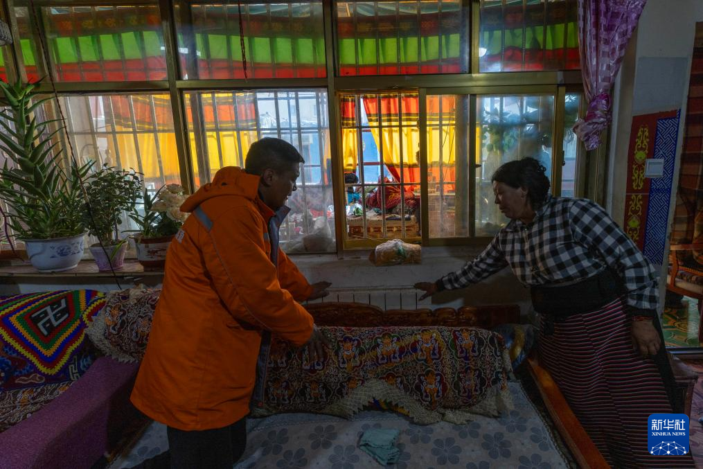 措勤縣城區(qū)清潔能源集中供暖特許經(jīng)營(yíng)項(xiàng)目工作人員次旺羅布(左)在扎日南木錯(cuò)社區(qū)居民曲珍家查看供暖情況(11月20日攝)。新華社記者 姜帆 攝