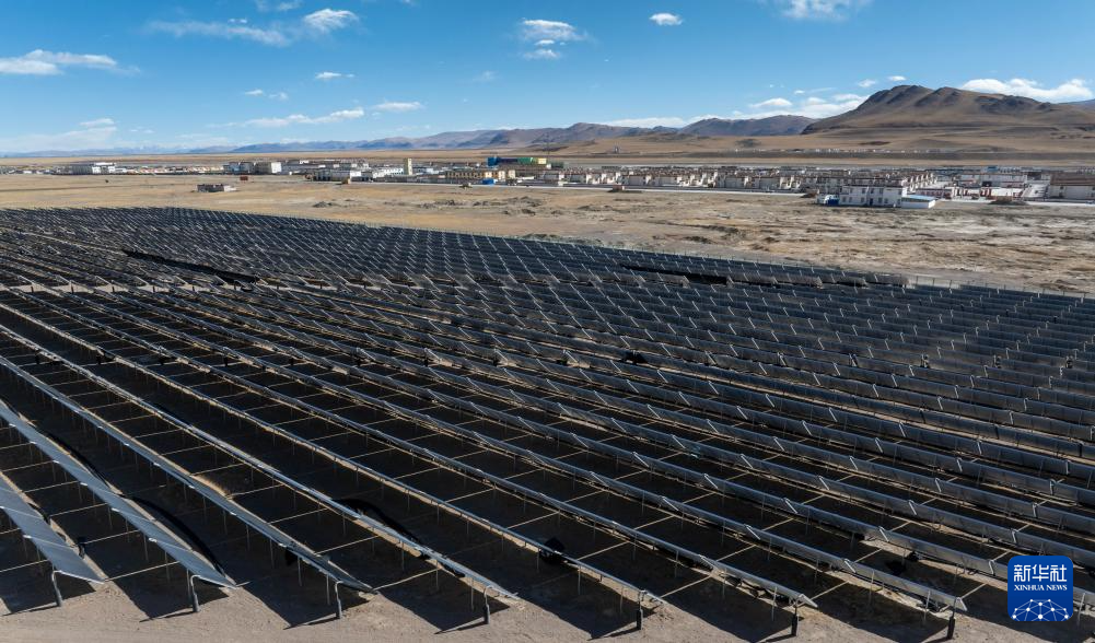 鳥瞰措勤縣城區(qū)清潔能源集中供暖特許經(jīng)營(yíng)項(xiàng)目的光伏陣列(無(wú)人機(jī)照片,11月20日攝)。新華社記者 姜帆 攝