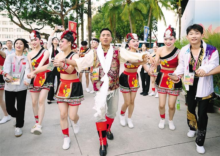 11月26日,運(yùn)動(dòng)會(huì)特別安排了“民族大聯(lián)歡”活動(dòng)。獨(dú)具海南特色的牛角號(hào)與蛙鑼齊齊奏響,喜迎八方賓客,表演者、運(yùn)動(dòng)員、教練員一起手拉手載歌載舞。西藏運(yùn)動(dòng)員身著盛裝,和來(lái)自北京西藏中學(xué)的運(yùn)動(dòng)員一起唱藏歌、跳鍋莊、送禮物,和香港特別行政區(qū)運(yùn)動(dòng)員互送吉祥物、紀(jì)念品,相互交流、拍照留念。