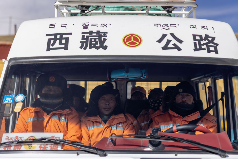 “天下第一道班”的養(yǎng)路工人們乘車去養(yǎng)護(hù)道路(12月1日攝)。新華社記者 姜帆 攝
