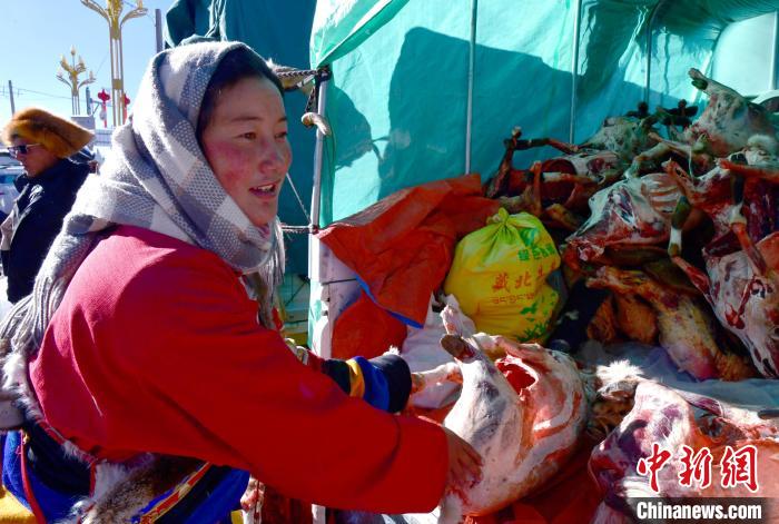 12月6日,西藏自治區(qū)那曲市申扎縣第十八屆畜產(chǎn)品展銷會(huì)現(xiàn)場(chǎng),牧民整理售賣的羊肉?!±盍?攝