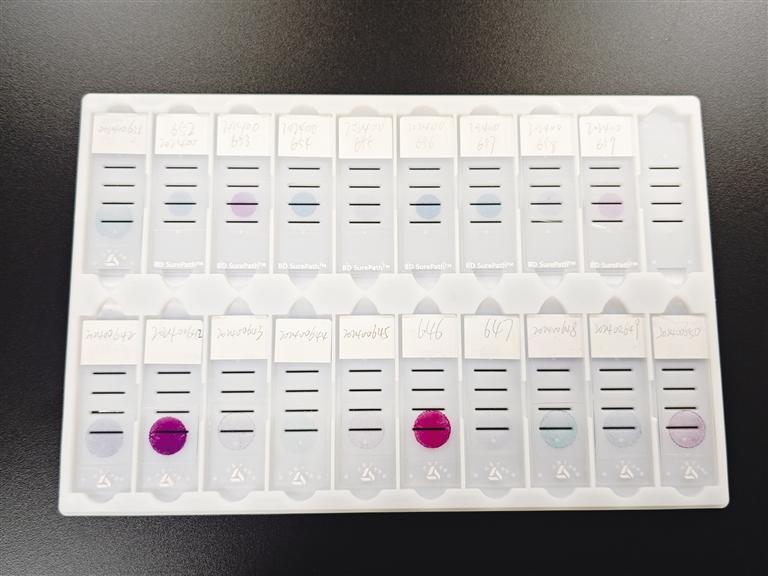 BD液基細(xì)胞制片儀所制的制片(上)與人工制片(下)對(duì)比圖。文/圖記者 黃帆 王鈞