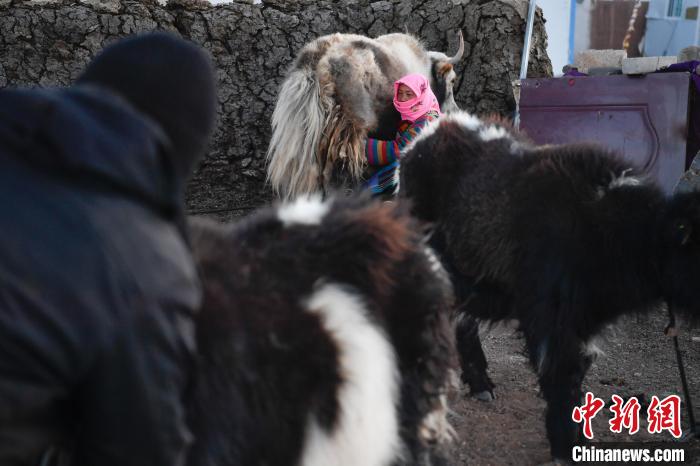 12月12日,西藏自治區(qū)那曲市安多縣帕那鎮(zhèn)牧民南色將自己的牦牛從牛圈放出。中新社記者 貢嘎來松 攝