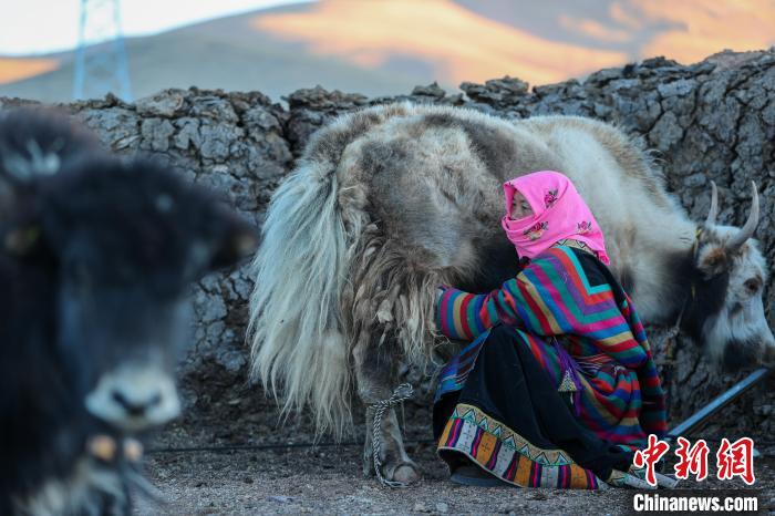 12月12日,西藏自治區(qū)那曲市安多縣帕那鎮(zhèn)牧民土巴卓瑪正準(zhǔn)備擠牦牛奶。中新社記者 貢嘎來松 攝