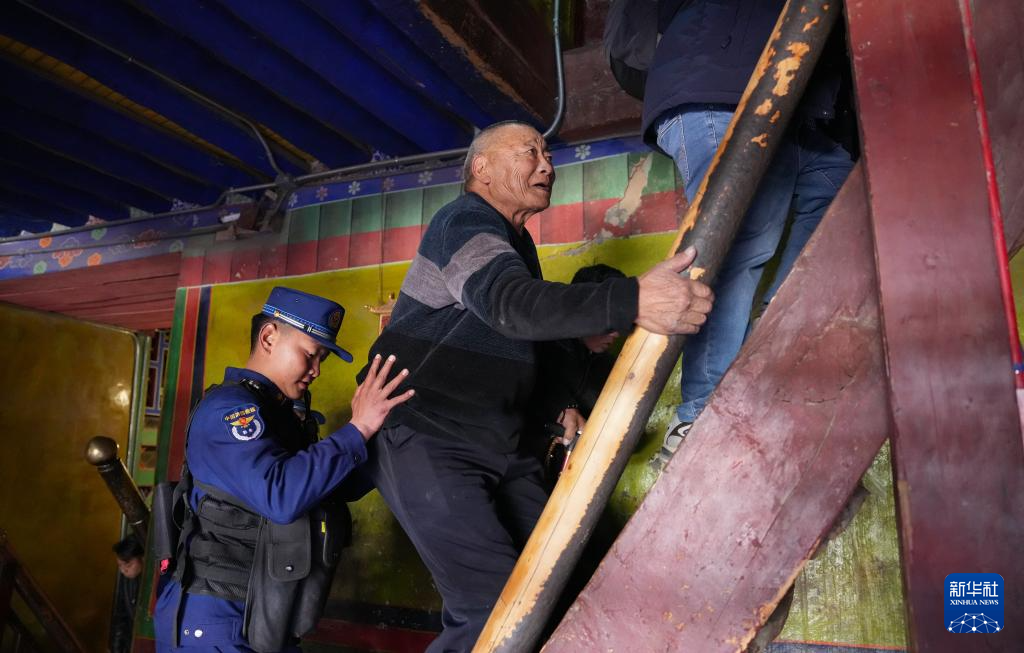 12月5日,布宮消防救援大隊隊員協(xié)助群眾上樓梯。新華社記者 晉美多吉 攝