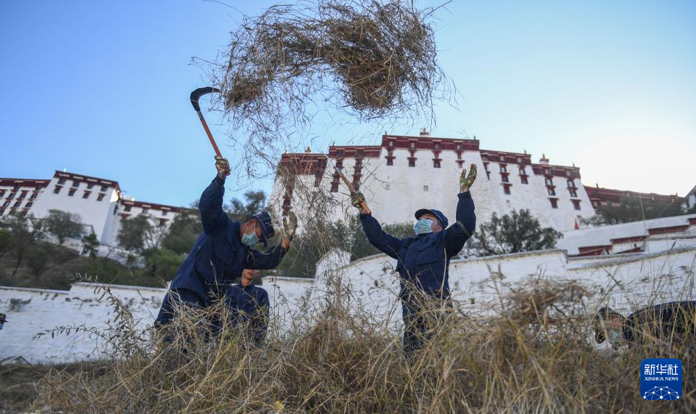 布宮消防救援大隊隊員在紅山上除草,消除冬季布達拉宮火災隱患(2019年11月6日攝)。新華社記者 晉美多吉 攝