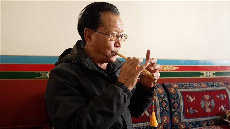 圖為國(guó)家一級(jí)演奏員次旦正在吹奏鷹笛。