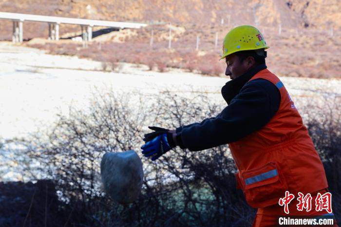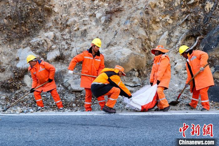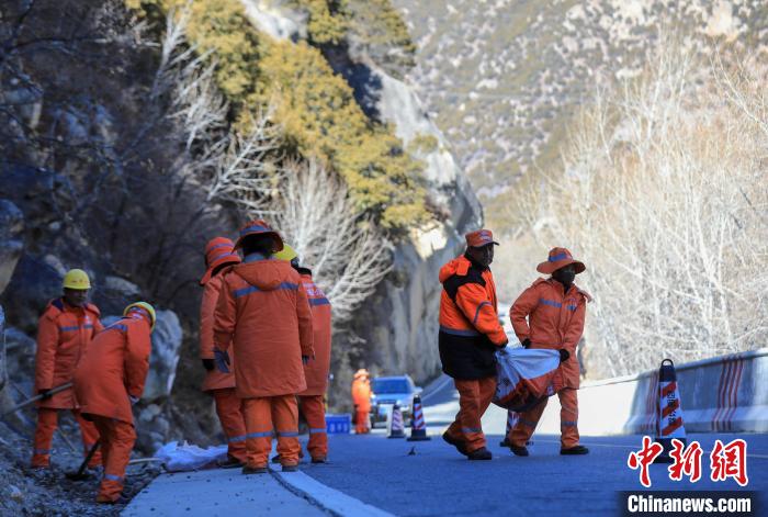 12月16日,西藏自治區(qū)林芝公路事業(yè)發(fā)展和應(yīng)急保障中心(工布江達(dá)養(yǎng)護(hù)段)道路養(yǎng)護(hù)工人及時清除川藏公路上的落石,保障道路暢通。該養(yǎng)護(hù)段擔(dān)負(fù)著川藏公路沿線工布江達(dá)縣路段的養(yǎng)護(hù)管理、應(yīng)急搶險等工作,包括路面修補(bǔ)、清理邊溝、維護(hù)交通安全設(shè)施等日常養(yǎng)護(hù)工作。圖為道路養(yǎng)護(hù)工人清理公路上的落石。中新社記者 貢嘎來松 攝