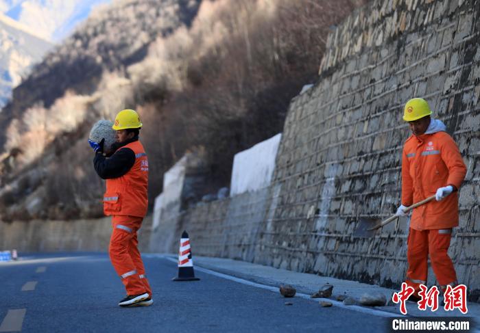 12月16日,西藏自治區(qū)林芝公路事業(yè)發(fā)展和應(yīng)急保障中心(工布江達(dá)養(yǎng)護(hù)段)道路養(yǎng)護(hù)工人及時清除川藏公路上的落石,保障道路暢通。該養(yǎng)護(hù)段擔(dān)負(fù)著川藏公路沿線工布江達(dá)縣路段的養(yǎng)護(hù)管理、應(yīng)急搶險等工作,包括路面修補(bǔ)、清理邊溝、維護(hù)交通安全設(shè)施等日常養(yǎng)護(hù)工作。圖為養(yǎng)護(hù)工人在公路上巡護(hù)。中新社記者 薛蒂 攝