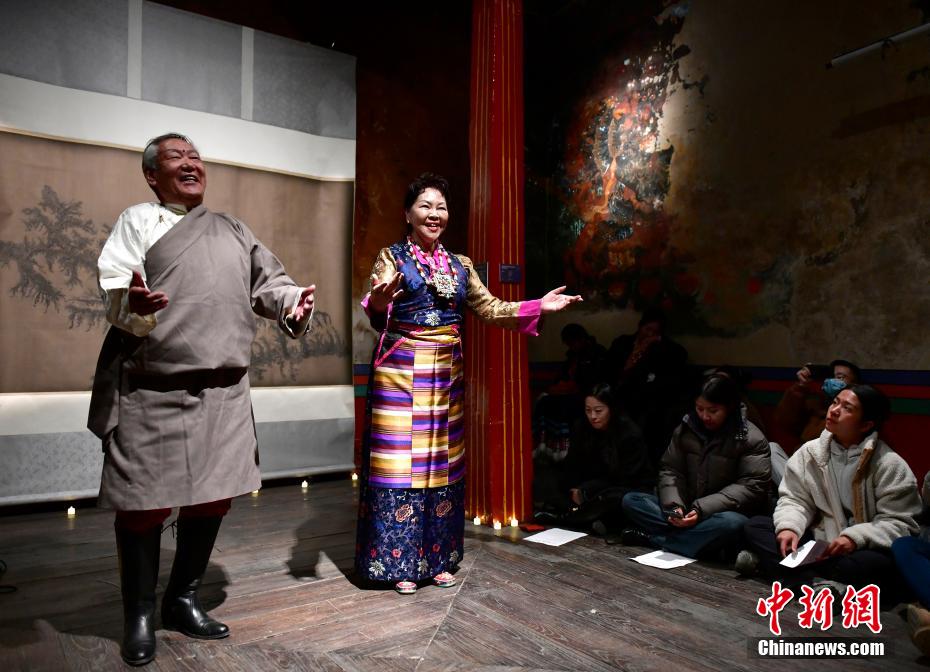 12月23日晚,西藏拉薩吉本崗藝術中心舉行吉光之夜活動。朗瑪堆諧、扎木念彈唱、熱巴舞等非遺展演,吸引眾多民眾共同領略西藏非物質文化遺產的無窮魅力。圖為拉薩堆諧傳承隊帶來的朗瑪堆諧《扎拉西巴》。中新社記者 李林 攝