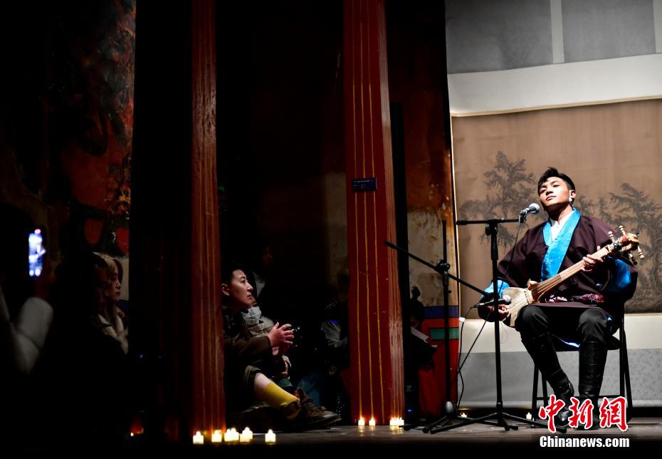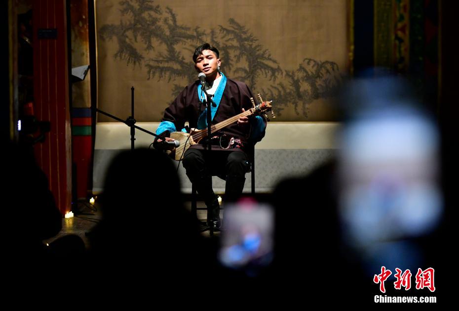 12月23日晚,西藏拉薩吉本崗藝術中心舉行吉光之夜活動。朗瑪堆諧、扎木念彈唱、熱巴舞等非遺展演,吸引眾多民眾共同領略西藏非物質文化遺產的無窮魅力。圖為扎木念彈唱《阿里札達民歌須彌山》。中新社記者 李林 攝