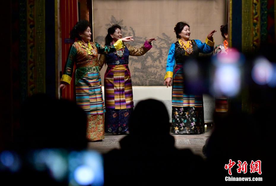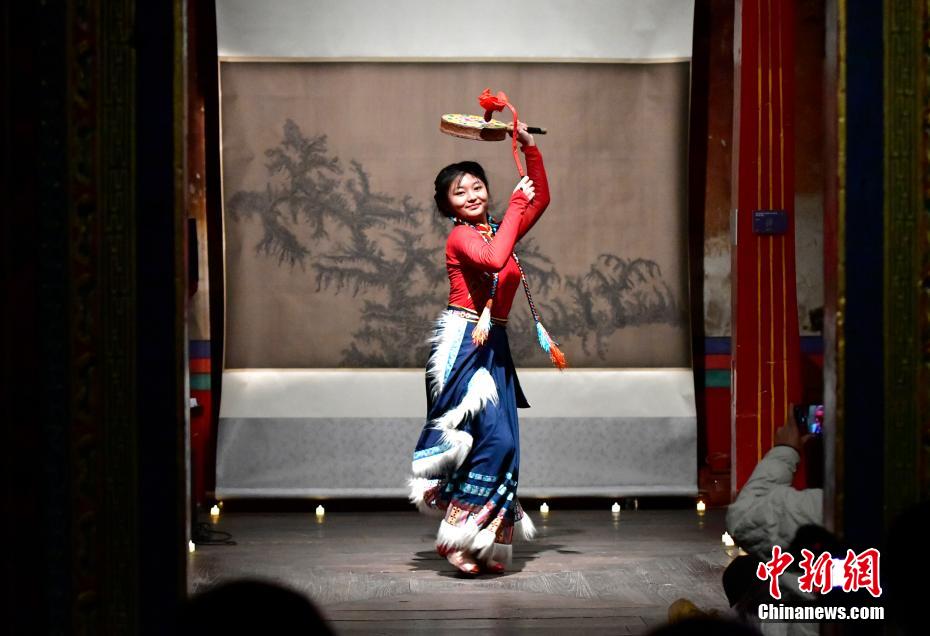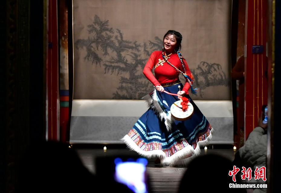 12月23日晚,西藏拉薩吉本崗藝術中心舉行吉光之夜活動。朗瑪堆諧、扎木念彈唱、熱巴舞等非遺展演,吸引眾多民眾共同領略西藏非物質文化遺產的無窮魅力。圖為熱巴舞《太陽鼓舞》。中新社記者 李林 攝