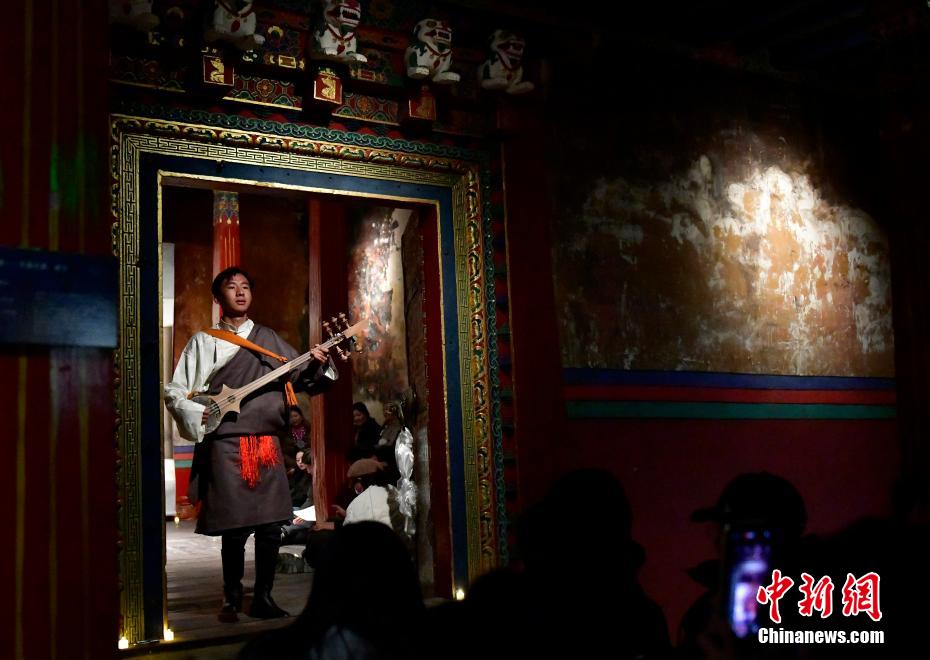 12月23日晚,西藏拉薩吉本崗藝術中心舉行吉光之夜活動。朗瑪堆諧、扎木念彈唱、熱巴舞等非遺展演,吸引眾多民眾共同領略西藏非物質文化遺產的無窮魅力。圖為扎木念彈唱《阿里札達民歌隆巴》。中新社記者 李林 攝