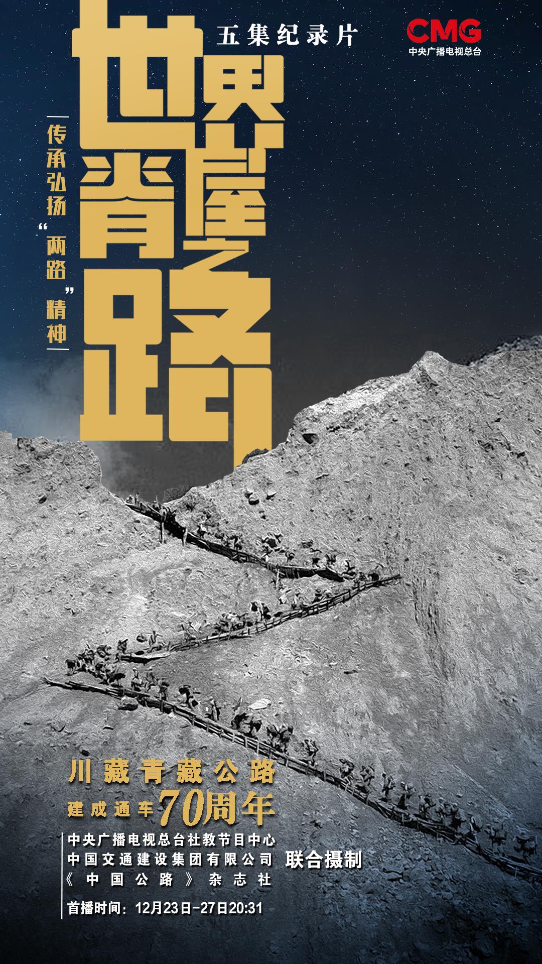 12月23日至27日,五集紀錄片《世界屋脊之路——川藏、青藏公路建成通車70周年》央視科教頻道(CCTV-10)每晚20:31播出。央視網、央視頻、央視科教新媒體矩陣同步播出。
