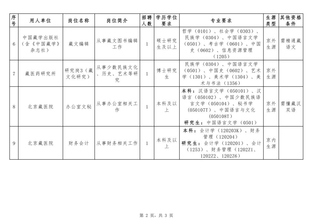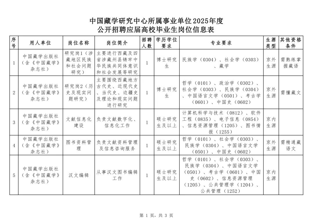 附件:中國藏學研究中心所屬事業(yè)單位2025年度公開招聘應屆高校畢業(yè)生崗位信息表