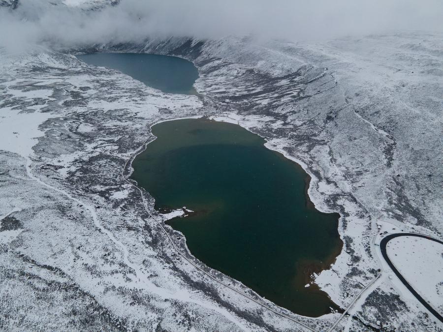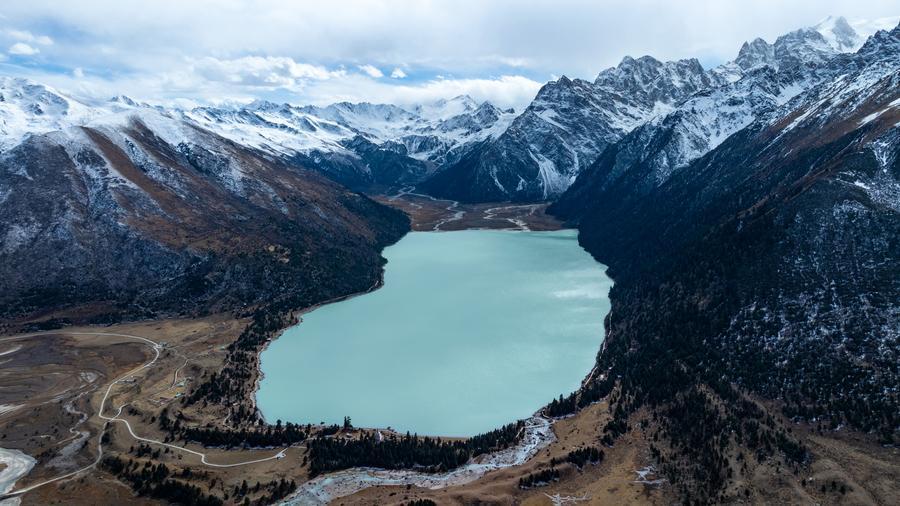 這是2024年11月1日在四川省甘孜州德格縣境內(nèi)拍攝的玉隆拉措(無人機(jī)照片)。新華社記者 沈伯韓 攝