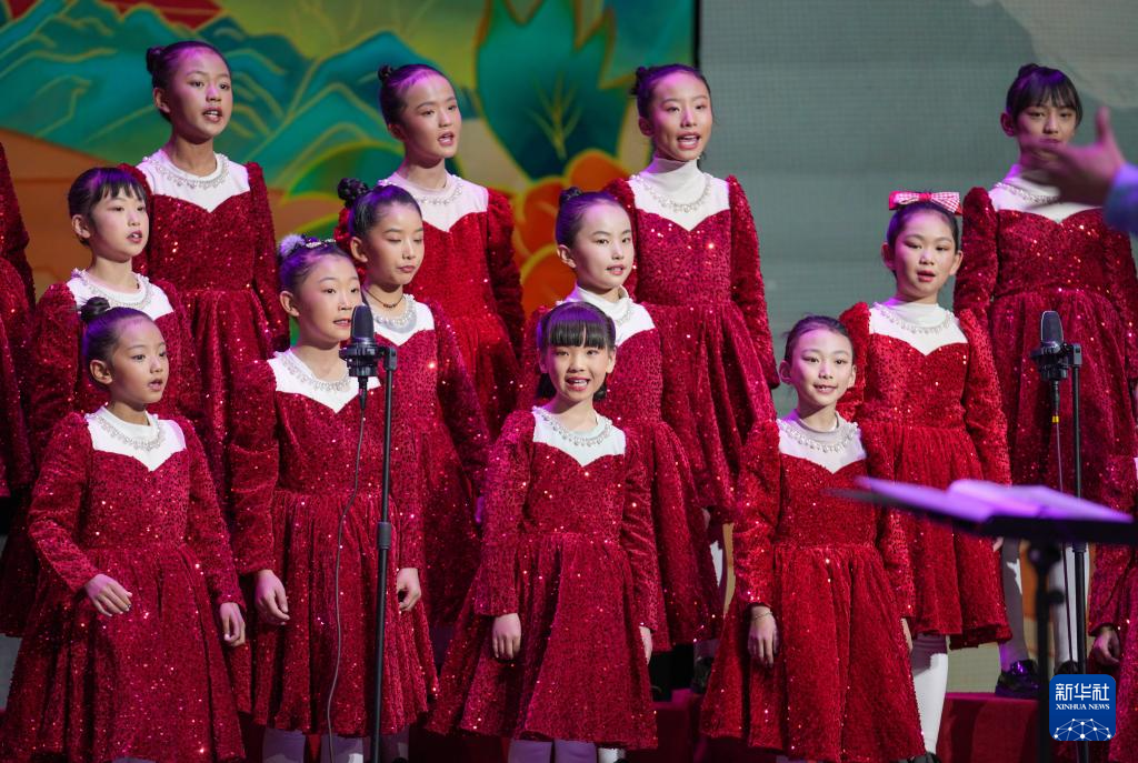 12月28日晚,西藏珠峰少年合唱團學(xué)員代表合唱歌曲《快快走唱首歌》。