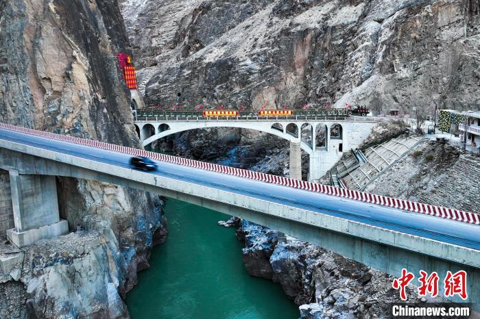 圖為12月19日,川藏公路,橫亙?cè)谂瓖{谷兩端間的怒江大橋。(無人機(jī)畫面)薛蒂 攝