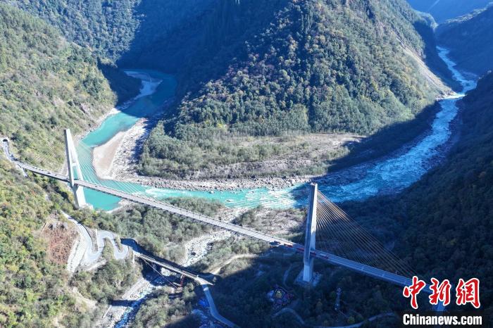 川藏公路西藏波密段昔日的“通麥天險(xiǎn)”路段如今已被大橋及隧道取代,圖為12月18日,迫龍溝特大橋與帕隆藏布江。(無人機(jī)畫面)中新社記者 趙凜松 攝