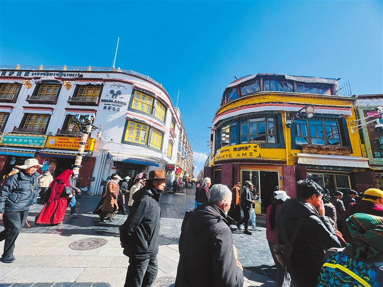 無論春夏秋冬,八廓街始終熱鬧非凡。每年春、夏、秋三季,國內(nèi)外游客紛至沓來;冬季,許多來自邊遠農(nóng)牧區(qū)的群眾會前來游玩、購買年貨。尤其是2024年“冬游西藏”活動的開啟,更是讓八廓街的人氣爆棚。走進八廓街,周邊的藏式特色建筑、琳瑯滿目的民俗風情商品、絡繹不絕的游客,共同構(gòu)成了一幅獨特而又和諧的畫面。這里商業(yè)與人文并存、傳統(tǒng)與現(xiàn)代交織,游客們既能感受到文化底蘊,又能享受到現(xiàn)代商業(yè)的便利和多元。