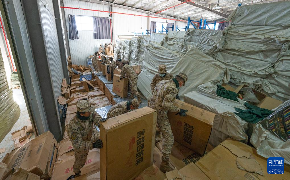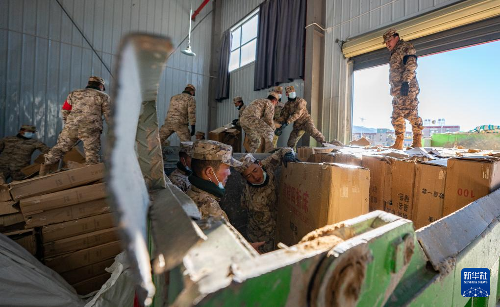 1月8日,在日喀則市經(jīng)開(kāi)區(qū)物資儲(chǔ)備倉(cāng)庫(kù),武警官兵在搬運(yùn)抗震救災(zāi)物資。新華社記者 丁增尼達(dá) 攝