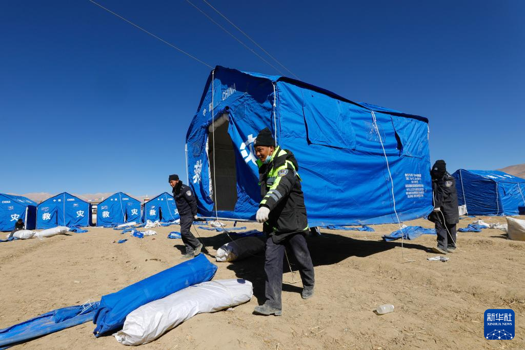 2025年1月8日,在日喀則市定日縣措果鄉(xiāng)雪珠村安置點,救援人員幫助受災群眾搭建帳篷。新華社記者 沈伯韓 攝